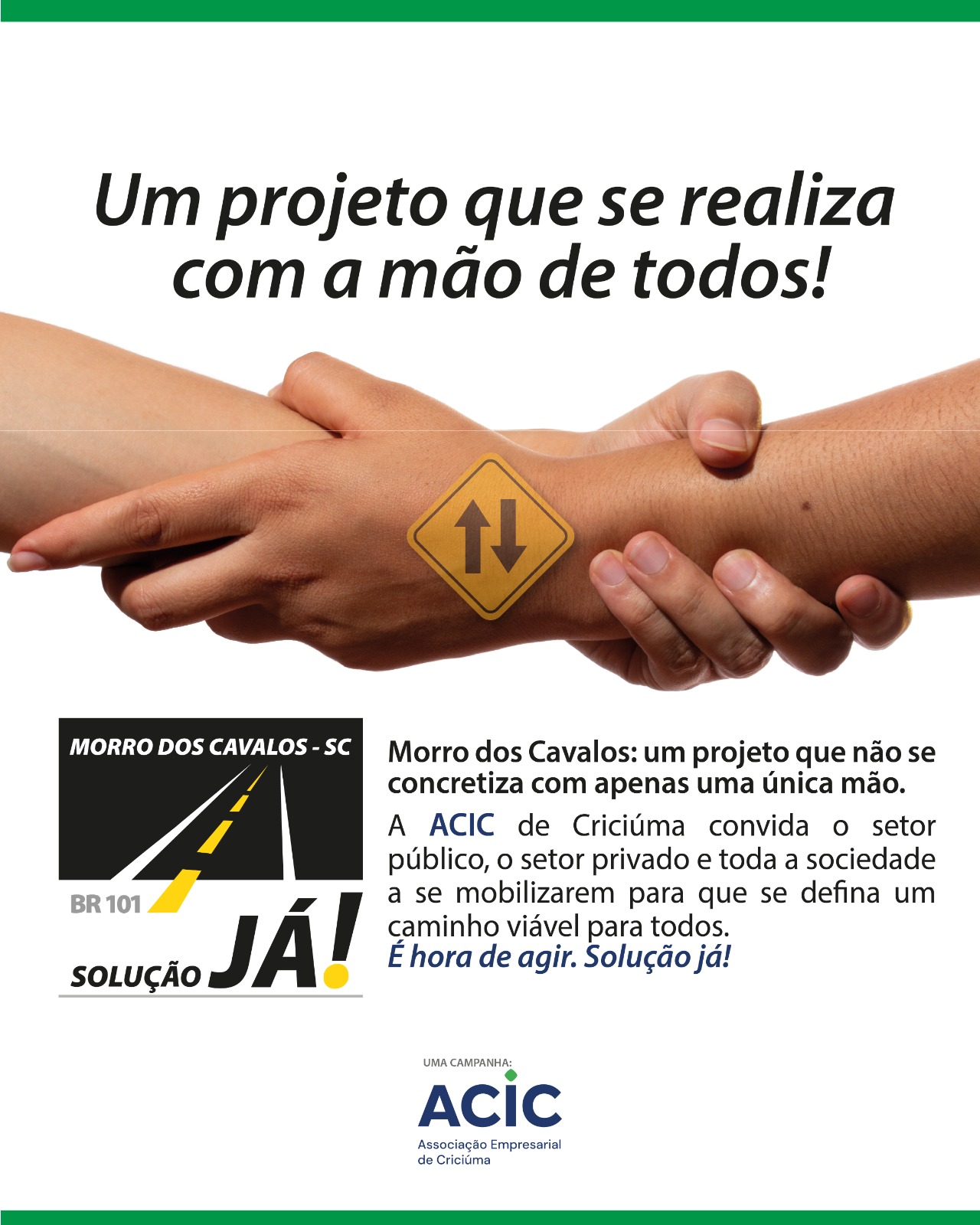 Nesta segunda-feira (7), a Associação Empresarial de Criciúma (Acic) lançou a campanha de mobilização regional “Morro dos Cavalos – Solução Já!”. A ação tem com o intuito sensibilizar a comunidade do Sul catarinense, empresários e poder público, para que se encontre e viabilize uma solução de forma urgente para o gargalo na BR-101, na altura do Morro dos Cavalos, em Palhoça.