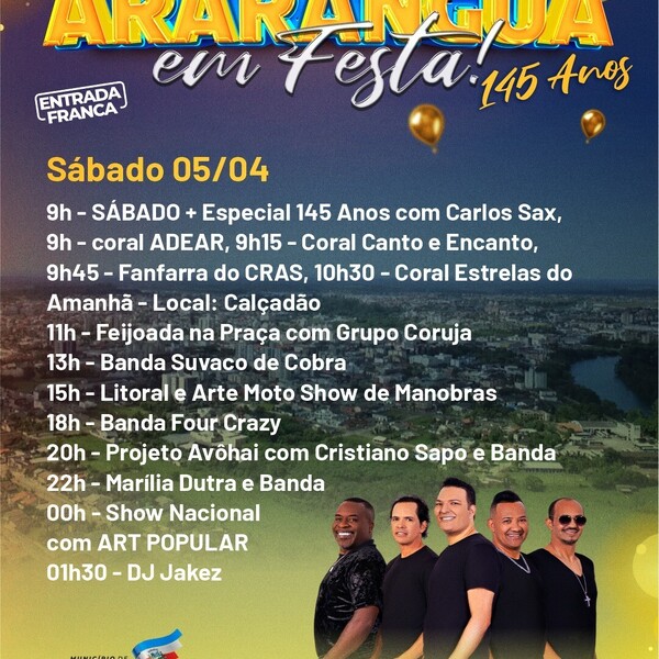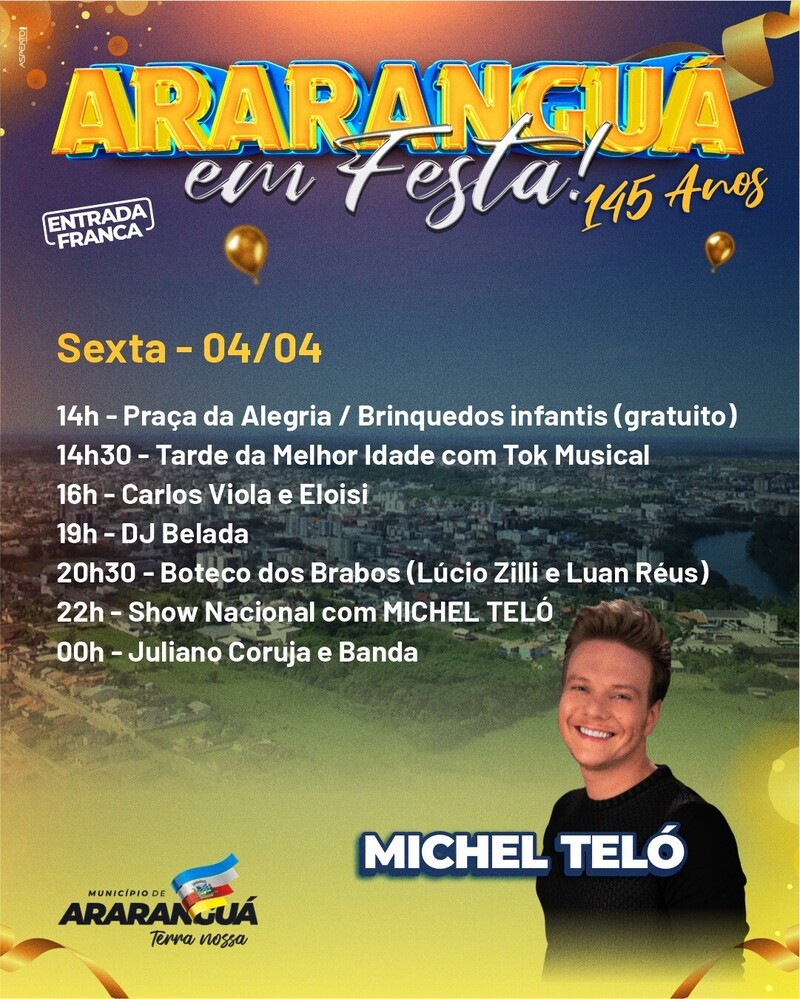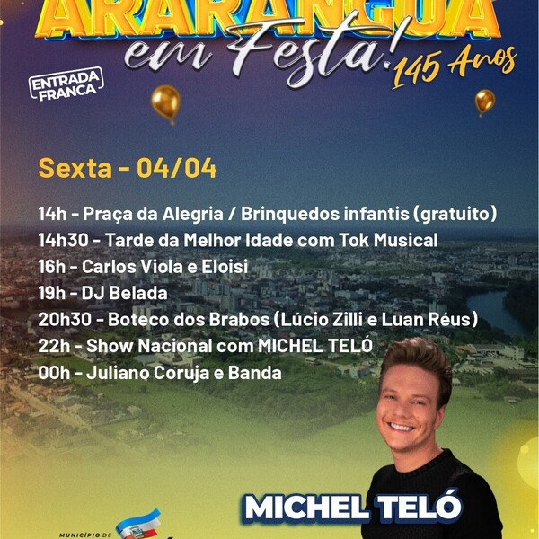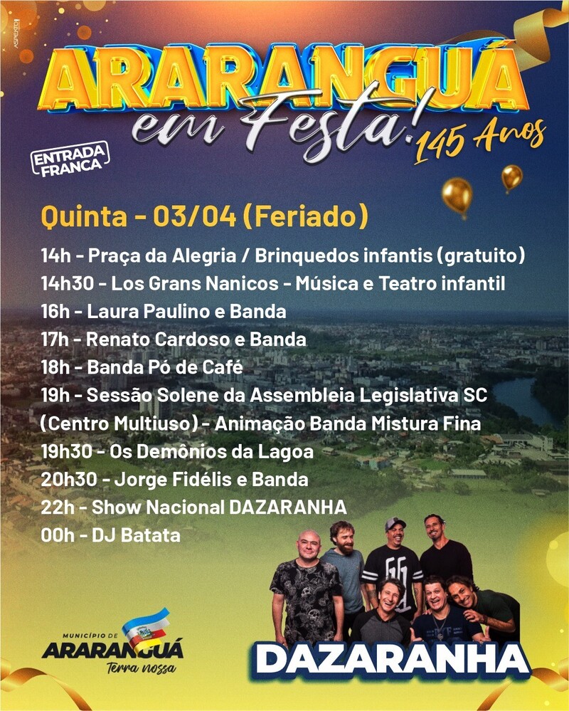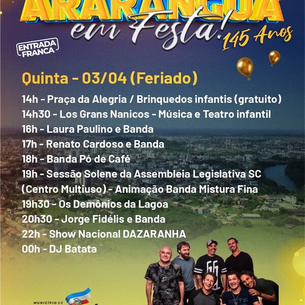 A Prefeitura de Araranguá divulgou a programação completa para a festa de aniversário de 145 anos do município. O evento será realizado de 3 a 5 de abril, na Praça Hercílio Luz, na área central da cidade.