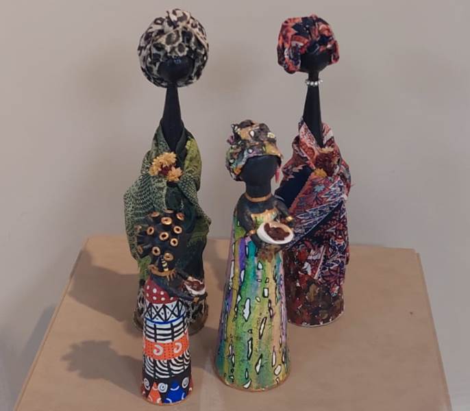 As peças foram confeccionadas com materiais como papéis reciclados, gaze, gesso, biscuit, massa corrida e retalhos de tecidos, resultando em criações únicas e cheias de história.