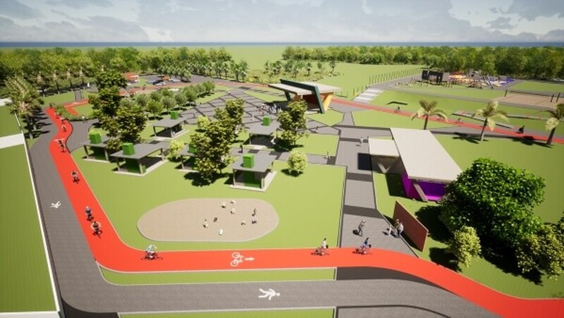 Já a área mais alta do parque contém quadras poliesportivas, quadras de areia para voleibol e beach tennis, circuito de parkour, parque radical infantil e cancha para futebol de areia.