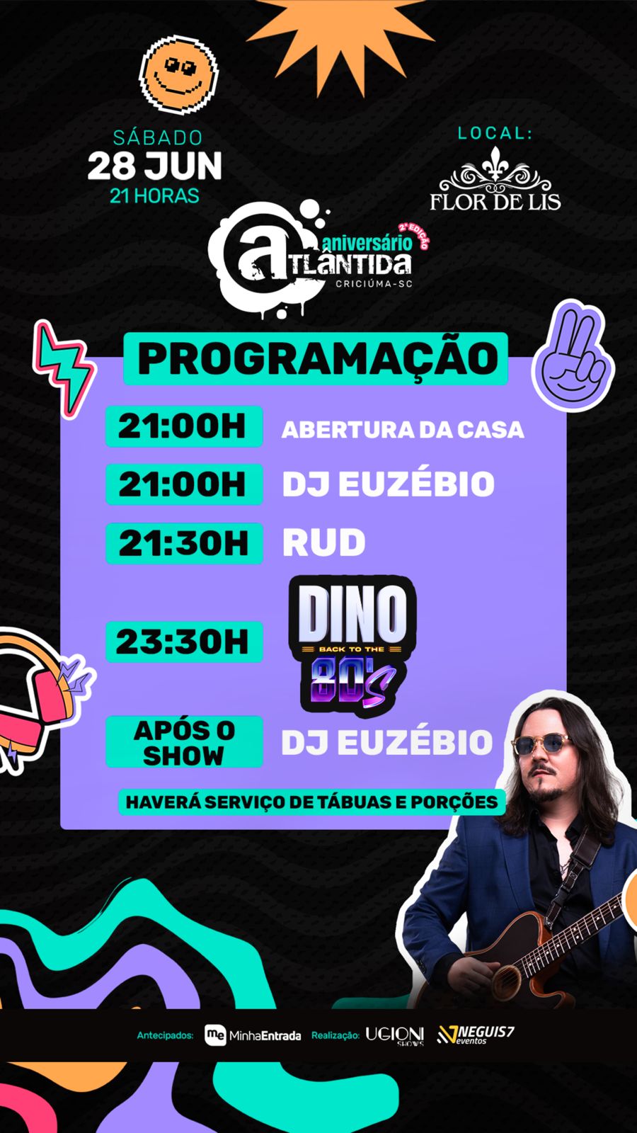 Um dos grandes nomes do pop rock brasileiro, Dino Fonseca traz um espetáculo recheado de clássicos, com a sua turnê: “Back to the 80's”. Os ingressos para o evento, em comemoração ao aniversário da Rádio Atlântida Criciúma, estão à venda pelo Minha Entrada.