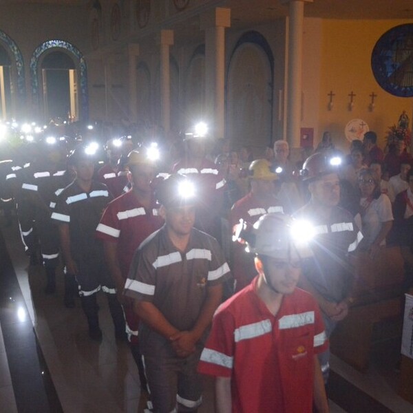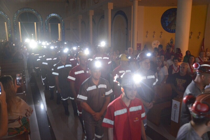 Um dos pontos altos da celebração foi a entrada dos trabalhadores. A iluminação da igreja ficou parcialmente acesa e as lanternas dos capacetes iluminaram o cortejo conduzindo a imagem de Santa Bárbara, padroeira dos mineiros. Em seguida, foi realizada a benção aos profissionais das carboníferas da região.