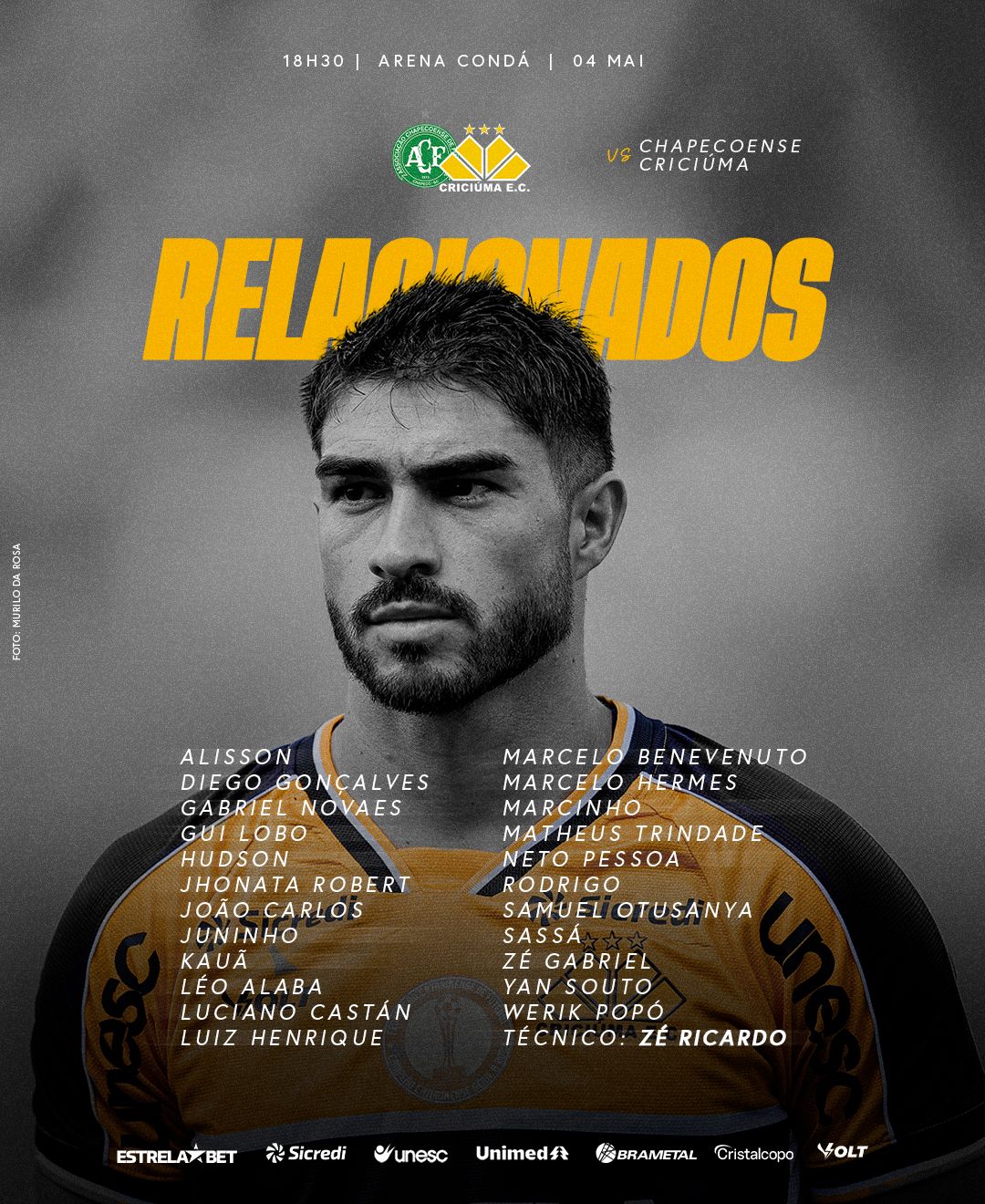 Confira a lista de atletas relacionados para o duelo contra a Chapecoense